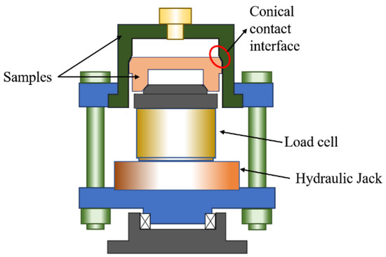 Design and fabricate the cone-cone contact specimen and loading device referencing the metal-to-metal seal structure of the premium connection. Figure 5 shows the schematic diagram of the loading device, and Figure 6 shows the experimental system. The axial loading force is applied by a 500 kN hydraulic jack (stroke is 10 mm), and the load is controlled by a 350 kN pressure sensor and displayed by a weighing instrument. The experimental measurement device is CTS-PA22A ultrasonic phased array instrument (GOWORLD, Guangzhou, China). The linear array probe contains 64 array elements, and the detailed parameters are shown in Table 1. The wedge of the probe was polished into an arc surface, which can closely fit with the upper sample. To ensure signal transmission, ultrasonic couplants are daubed between the probe wedge and the sample, amplitude calibration is required prior to the use of the probe.