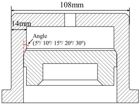 The lower sample in the contact sample exhibits an outer diameter of 85 mm and is made of 30 Mn5. In addition, the upper sample exhibits an outer diameter of 108 mm and is made of 28 MnTiB. The materials employed in the sample are typical for petroleum pipelines. Figure 7 illustrates the sample’s structure. Cone-cone contact specimens with sealing surface angles of 5°, 10°, 15°, 20°, and 30° are processed as the sealing surface angle of the premium connection generally ranges from 0° to 30°. The sealing contact length for the 30° specimen is 3 mm, whereas it reaches 5 mm for the others. A profile measuring instrument is adopted to scan the respective specimen, so as to examine the angle and roughness of the sealing surface. The angular error of the five sets of samples falls in the acceptable range as defined by the BT standard recommendation, suggesting that the permitted angular error reaches 20.5”. The five sets of samples’ equivalent roughness range from 1.4 to 1.6 um. Table 2 lists the specific parameters for the samples.