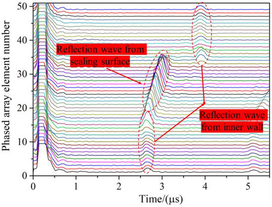 Deflection and focusing-deflection have different detection effects and vary with the angle of the sealing surface. Prior to loading, ultrasonic phased array equipment is adopted to examine the echoes of the upper sample at the angle of 5°, 10°, 15°, 20°, and 30°. The excitation aperture is set at 1 for deflection and 16 for focusing-deflection. The deflection angle is regulated by the sealing surface’s angle. Figure 8 presents the ultrasonic signal from a 10° specimen acquired in focusing-deflection mode, i.e., the signal distribution after envelope processing. The estimation of the echo arrival time becomes more exact, which is recognized as a benefit. As depicted in the figure, the reflected signals originate from the sample’s inner wall and sealing surface.