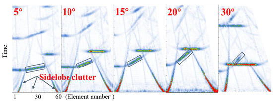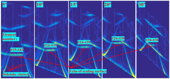 Figure 9 presents the time domain signals for the 5 sets of samples under the excitation aperture of 1. The X-axis is the element number, and the Y-axis is the time. The ultrasonic amplitude is greater the darker the hue. As can be observed, both the sample’s inner wall and the sealing surface’s reflected echo can be received. However, the phenomenon of sidelobe clutter and ultrasonic energy leaks develop as a result of the large number and size of ultrasonic phased array elements, interfering with the reflection field. When the sealing surface angle increases, the effect of the sidelobe clutter grows. Figure 10 displays the time domain signals for the 5 sets of samples under the excitation aperture of 16. The strength of the sidelobe clutter is substantially weaker, and the reflected echo energy of the inner wall is also significantly reduced in the sample with a larger angle, which makes it easier to identify the reflected signal from the sealing surface. However, when the angle of the sealing surface is small, echoes from other interfaces will still be received. Additionally, it can be shown that while retaining the same amplitude gain, the echo peak of the sealing surface falls overall with an increase in the angle. To ensure that the sealing surface’s echo may be successfully picked up when the angle of the sealing surface is larger, the amplitude gain must be increased. In conclusion, in ultrasonic phased array measurement of the sealing surface, activation aperture 16, deflection angle equal to the sealing surface angle, and appropriate gain are considered.