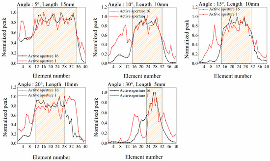The peaks obtained are normalised, and the peak profiles on the sealing surface are compared under the excitation aperture of 1 and 16. The result is shown in Figure 13. As depicted in the figure, the wave peak distribution trend is the same for the deflection and the focusing-deflection ways of extracting the reflected wave peaks of the sealing surface. Overall, it shows a convex distribution trend with initial increases and subsequent declines. A peak flat zone is formed when the number of sound beams with high peaks grows as the length of the sealing surface increases. The ultrasonic energy concentration was higher at activation aperture 16 compared with the findings of activation aperture 1, and the wave peaks on the sealing surface changed substantially less and were noticeably higher than those on other surfaces. It further exemplifies the high measurement quality achieved with the focusing-deflection mode.