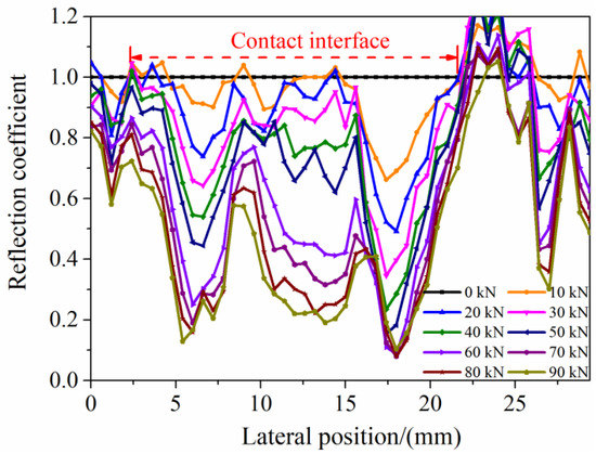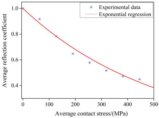 The echo peak at the contact interface under different loading forces is extracted, and the corresponding reflection coefficient is determined. Figure 15 illustrates the reflection coefficient profiles with loading force, and the transverse position was determined by the scanning width of the probe. The reflection coefficients of each acoustic beam do not vary evenly because of the roughness of the interface, suggesting that the real contact interface’s contact stress does not have an ideal uniform distribution. The average contact stress of the interface can be determined by the contact area and loading force. The correlation between average contact stress and average reflection coefficient can be fitted by exponential regression. The exponential fitting curve is shown in Figure 16. The correlation coefficient reaches 0.96, and the result of exponential regression is written as:
