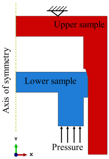 The contact stress distribution of sealing interfaces at different angles should be calculated to verify the reliability of ultrasonic phased array measurement of contact stress. The finite element simulation software Abaqus is adopted to create 2D axisymmetric contact models of five groups of samples, as illustrated in Figure 17. The elastic modulus is 210 GPa, the Poisson’s ratio is 0.3, the elastic coefficient is 0.15, and the contact type is hard contact in the model. By getting the standard specimen ready for the tensile test, one may determine the material’s yield strength. The lower specimen’s yield strength is 400 MPa, whereas the upper specimen’s yield strength is 500 MPa. The angle and length of the sealing surface are consistent with the sample employed in the experiment. The symmetry axis employs a symmetric boundary, the upper end of the upper sample is fixed, the lower end of the lower sample pressure is applied, and the total loading force is the product of the pressure and area.