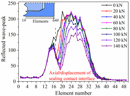 The axial load is applied to a 15° cone-cone contact sample. The ultrasonic phased array probe is fixed on the outer wall of the upper sample, in which the echo of the sealing surface can be received. Element #1 is on the large end of the conical contact, and element #64 is on the small end of the conical contact. The activation aperture of the ultrasonic phased array is set to 16, a total of 49 acoustic beams are emitted, the incident angle is set to −15°, and the deflection direction is perpendicular to the sealing surface. An ultrasonic phased array is utilised to gather signals following each loading, with a loading interval of 20 KN. The reflected wave peak of the sealing surface is derived following the time compensation of the collected signal. Figure 19 illustrates how the loading force alters the reflected wave peak profile. The upper sample’s 10 mm sealing surface length corresponds to 17 elements, which are represented in the figure as element #16–element #32. The sealing contact length is 5 mm, and the corresponding number of elements is about 9. The figure illustrates how the reflected wave peak’s change is not uniform. The most noticeable peak drop occurs in element #17, located at the contact’s big end. The reflected wave peaks of the small end tend to decline with the increase of the load. This is brought on by the effect of inevitable angle machining errors. The big end contacts first throughout the contact process, and as the interference increases, the small end touches. Another discovery is that as the loading force increases, the element where the peak drops the fastest moves to the small end, reflecting the relative axial displacement of the contact and being consistent with the displacement outcomes seen in the contact stress simulation.