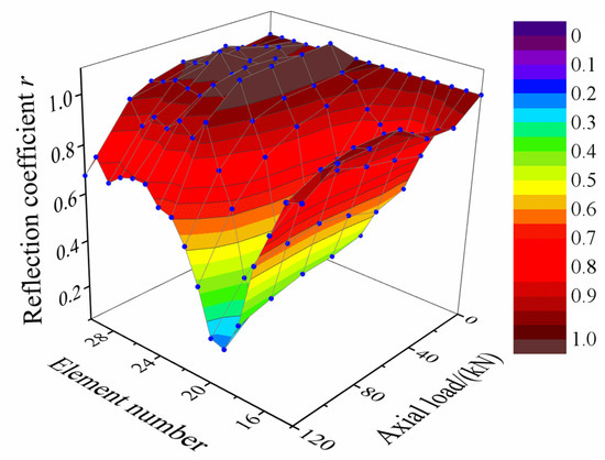 The reflection coefficient of each element is determined. The smaller the reflection coefficient, the greater the contact stress. Figure 20 shows the calculation results of reflection coefficients of element #14–element #30 under different loads. In the colour bar, red indicates values close to 1, with high reflected wave peaks and low or no contact stress. Light colours indicate values less than 1, corresponding to high contact stresses. When the axial load is loaded, the reflection coefficient of element #14–element #16 changes slightly, and the reflection coefficient of element #17–element #26 drops significantly to 0.2. The reflection coefficient of element #27–element #30 declines to around 0.7. In addition, the reflection coefficient is not changed synchronously. To analyse the echo change of the sealing surface, the reflection coefficient curve of element #17–element #26 changing with load is drawn, as shown in Figure 21. As the axial load increases, the reflection coefficients of element #19 and element #20 decrease continuously. After 20 KN, the reflection coefficient of element #17 is reduced from 1 to 0.6 and remains constant, while the reflection coefficient of element #21 begins to decrease. After 50 KN, the reflection coefficient of element #22–element #26 begins to decrease, and the reflection coefficient of element #18 flattens out. Thus, the signal of the ultrasonic phased array will respond to the change of contact pressure and relative position of the sealing surface during contact.