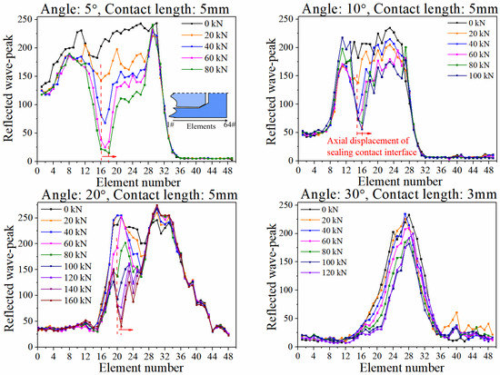 Likewise, the contact samples of 5°, 10°, 20°, and 30° are loaded and examined using an ultrasonic phased array. Figure 22 presents the reflected wave peak profiles. The horizontal axis is the element number, with element #1 in the direction of the big end. The reflected wave peaks, similar to those at the 15° sample, indicate the most pronounced drop at the large end of the contact. It can be distinguished even though the contact length only reaches 3 mm at the 30° sample. Under the same load, the reflected wave peak tends to be increased from the big end to the small end. With the increase of the axial load, the reflected wave peak of the seal interface at different angles declines gradually. The lowest point of the reflected wave peak moves towards the small end during the loading process, which is the result of the axial movement of the contact position. Moreover, with the increase of the sealing surface angle, the displacement declines in the same load range, consistent with the simulation results.