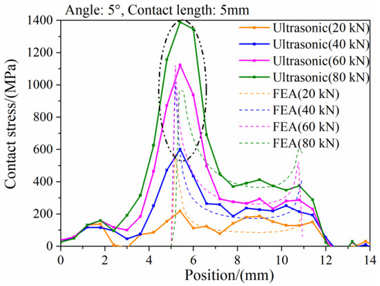 Comparison of contact stress between simulation and ultrasonic phased array measurement (5° specimen).