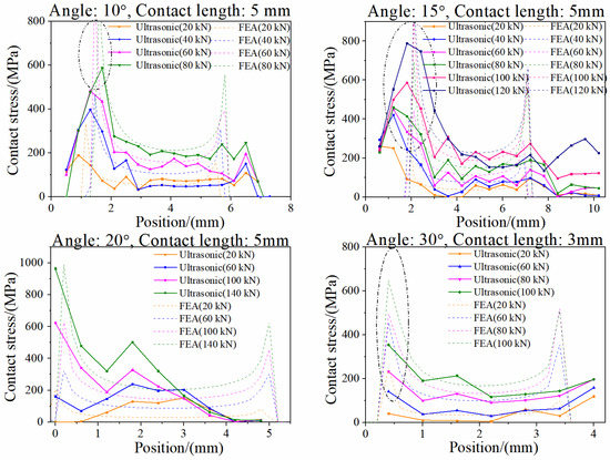 Comparison of contact stress between simulation and ultrasonic phased array measurement (10°/15°/20°/30° specimens).