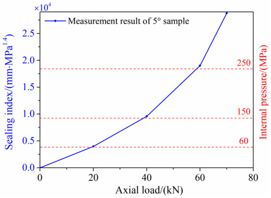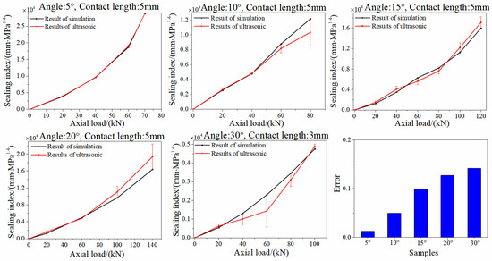 - The sealing index can be adopted to quantify sealability. The sealing index increases with the increase of axial load, which means that the sealing requirements of higher gas pressure can be met. Compared with the calculated results of finite elements, the measurement error of the ultrasonic phased array is less than 15% in the allowable error range. Moreover, the measurement error will be reduced with the decrease in the angle of the sealing surface.