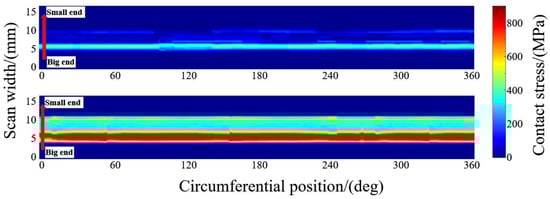 Lastly, the contact stress of the 5° sample is expressed by means of a nephogram. Figure 27 presents the distribution of circumferential contact stress under both low and high loads. At low load, the whole sealing torus is in a state of low contact stress, forming a continuous narrow contact band at the big end of the sealing surface, and the contact stress at the small end is small or even discontinuous. At high loads, the contact stress of the big end of the sealing surface exceeds the yield strength, and the contact stress on the whole sealing surface is continuously and uniformly distributed. The overall contact stress is at a high level. The contact stress distribution visualisation of the sealing surface is achieved through the representation of the cloud image, which takes on critical significance to engineering applications.