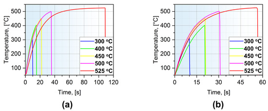 Temperature–time profiles recorded during the heating stages of the solution heat treatments at different target temperatures of the (a) low-heat-input weld and (b) high-heat-input weld.