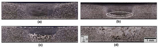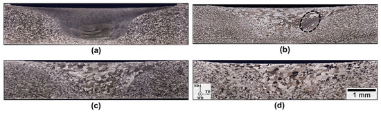 Effect of heating to various target temperatures on the microstructure evolution in the high-heat-input weld: (a) 450 °C, (b) 485 °C, (c) 500 °C, and (d) 525 °C. The magnification is the same in all micrographs. The reference frame for all welds is shown in (d). The normal direction, welding direction, and transverse direction are denoted as ND, WD, and TD, respectively. The retreating side is on the left, and the advancing side is on the right. See Section 3.2.2 for details.