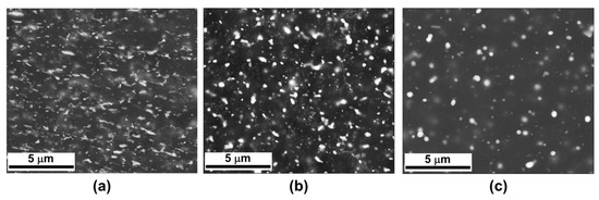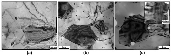 In agreement with the observations made using SEM, a relatively high volume fraction of secondary precipitates was observed in the as-welded condition of the low-heat-input weld (Figure 7a). Meanwhile, upon heating to 450 °C during the post-weld heat treatment, the precipitates increased in size and concurrently dissolved (Figure 7b). In contrast, the high-heat-input weld contained a low fraction of precipitates in the as-welded condition (Figure 8a). However, the post-weld heating to different temperatures appeared to have resulted in the nucleation (Figure 8b) and coarsening of precipitates (Figure 8c).