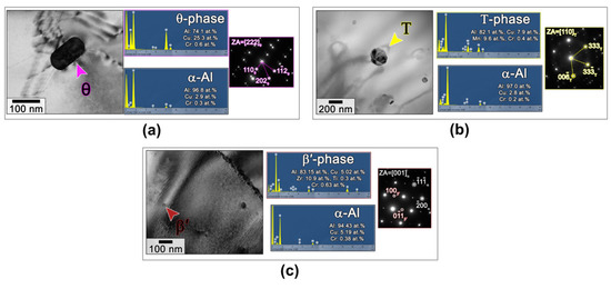 To acquire additional information on the secondary precipitates, a TEM-EDS analysis was carried out, and the results are summarised in Figure 9. The results suggest that θ-phase (Al2Cu) was the dominant precipitate in the microstructure of the stir zone (Figure 9a), although a measurable portion of T-phase (Al20Cu2Mn3) was also revealed (Figure 9b). The nanoscale precipitates that appeared in the heat-treated weld at the near-solution annealing temperatures were identified as β′ (Al3Zr)-phase (Figure 9c). It is worth noting that the density of the revealed non-homogeneously distributed β′-phase was relatively low. It was therefore unlikely that these particles had a substantial influence on the grain growth behaviour.