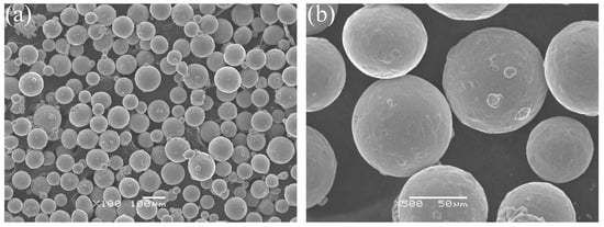 The commercial Ti-6Al-4V powder supplied by Xi’an Sailong Metal Materials Co., Ltd. (Xi’an, China) was used in the experiment. The chemical composition of the powders is shown in Table 1. As shown in the scanning electron microscopy (SEM) image in Figure 1 (SIGMA, Zeiss, Oberkochen, Germany), the powder had high sphericity and few satellite spheres, with a particle size range of 54–106 μm.