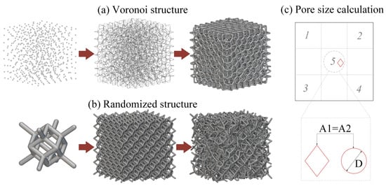 Schematic image of stochastic porous structure modeling of (a) the Voronoi structure and (b) the randomized structure; and the calculation method of the pore size for the porous structures (c).