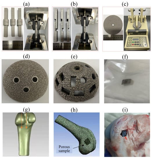 Fabricated porous samples for mechanical properties and the corresponding testing devices: (a) tensile testing; (b) shear testing; (c) abrasion resistance testing. The porous implant preparation (d–f) and the implantation of the porous implant (g–i): (d) acetabular cup with the designed porous geometry; (e) acetabular cup after cutting; (f) the sterilized porous implant; (g) the femur model of beagle dog; (h) schematic image of the implantation; (i) the porous implant in the dog femur.
