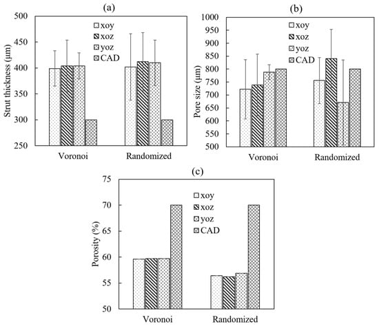 For the porosity, the Voronoi structure had a porosity of 60%, while the randomized structure showed a porosity of 57%, which did not exhibit an obvious difference (p value = 0.8750). Compared to the design porosity of 70%, the actual value had a decrease of around 26.8%. The actual porosity of the porous structures was directly related to the actual strut thickness. The increase in the actual strut thickness led to an increase in the solid material volume of the porous structures, which further decreased the pore volume of the whole structure. This resulted in a decrease in the overall porosity of the porous structure. In addition, as illustrated in Figure 5c, the porosity distributions in three different planes were quite consistent for both designs.