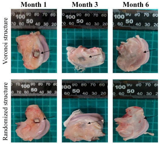 Gross samples at each follow-up time point for the two porous designs (the black arrow indicates the implant location).
