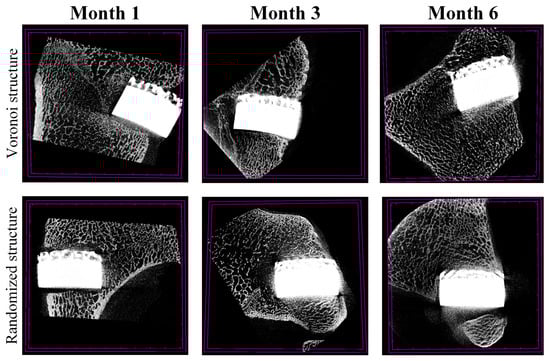 Micro-CT of the Voronoi structure group and the randomized structure group at each follow-up time point.