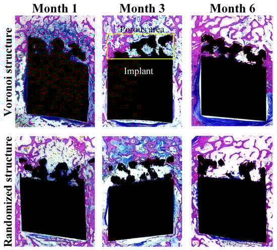 Figure 7 illustrates the micro-CT images for the two porous designs during different follow-up periods (1 month, 3 months, and 6 months). The porous implants of the animals in each group were in good shape without obvious deformation, and new bone tissue had grown into the gaps on the pore surface of the implants. Gaps became fuzzy at month 3 and almost disappeared at month 6 for both structures. No significant difference was observed between the Voronoi structure group and the randomized structure group at each follow-up time point. Due to the strong metal artifacts and irregular shapes of the porous implants, it is impossible to accurately observe and evaluate the bone ingrowth and osseointegration between the implant and the bone. Therefore, histopathological observation was conducted to conduct a semi-quantitative analysis on the area of new bone tissue in the porous implants.