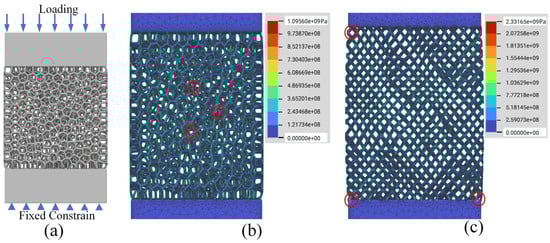 (a) Loading conditions of porous structures; (b) FEA results for the Voronoi structure; (c) FEA results for the randomized structure. (The red circles indicate the maximum stress locations in porous structures).
