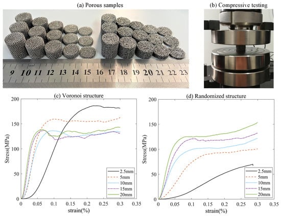 (a) Fabricated porous samples with different heights; (b) loading conditions during the compressive test; (c) strain–stress curves for Voronoi structures; (d) strain–stress curves for randomized structures.