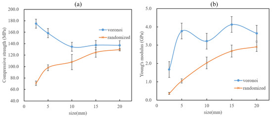 As illustrated in Figure 10c,d, both structures exhibited obvious different strain–stress curves when the sample height varied from 2.5 mm to 20 mm. Moreover, both the compressive strength and Young’s modulus had different tendencies with different sample sizes. The detailed relationships between the mechanical properties and the sample height are shown in Figure 11. It is obvious that the Voronoi structures had a higher compressive strength and Young’s modulus than the randomized structures, which matches the lower stress concentration caused by the boundary effect shown in Figure 9. When the sample height varied from 2.5 mm to 20 mm, the compressive strength of the Voronoi structures exhibited a decreasing tendency, while the randomized structures showed an increased tendency (Figure 11a). The compressive strength tended to stabilize when the sample height increased to 15 mm. On the other hand, Young’s modulus tended to increase with the increase in sample height for both the Voronoi structures and the randomized structures. Overall, Young’s modulus appears to stabilize when the sample height goes to 15 mm. Therefore, it can be concluded from Figure 11a,b that the mechanical properties tend to converge to consistent values when the sample height increases sufficiently, even though different porous structures may have different characteristic stabilization sample heights. In general, the size and boundary effects could directly affect the mechanical properties of porous structures, and different pore geometries tend to exhibit different reactions to these effects.