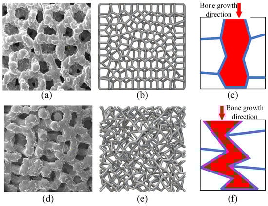 Designed and fabricated pore geometry of the two porous designs: (a) fabricated Voronoi structure; (b) designed Voronoi structure; (c) bone growth direction of Voronoi structure; (d) fabricated randomized structure; (e) designed randomized structure; (f) bone growth direction of randomized structure.