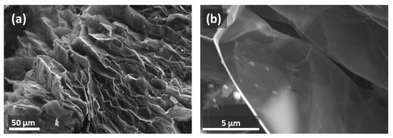 High-resolution SEM photos of graphite platelets (GP) after thermal exfoliation at 600 °C; (a) magnification ×500; (b) magnification ×10,000.