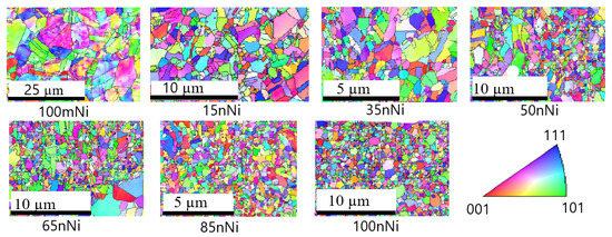 To provide a better understanding of the ratio of graphene to metal matrix effects on the final properties of composites, microstructure and mechanical properties of the reference specimens—specimens produced from the powder mixtures with 0, 15, 35, 50, 65, 85 and 100 wt.% of nano-Ni—were investigated. Typical inverted polar figures (IPF) images obtained by EBSD for the above specimens are shown in Figure 2. As seen from the figure, the number of dislocations is negligible in all specimens, while the grain boundaries are clearly defined. All specimens can be characterized by a high amount of high-angle grain boundaries (HABs) and twins. Specimens with the maximum nano-Ni contents (100nNi and 85nNi) also demonstrated significant grain growth during the manufacturing process. Note that the mean size of the initial nano-powder particles was ~80 nm; therefore, a three times magnitude growth can be observed.