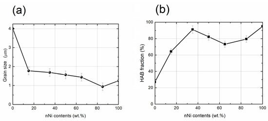 (a) Mean grain size and (b) HABs fraction as a function of nano-Ni contents.