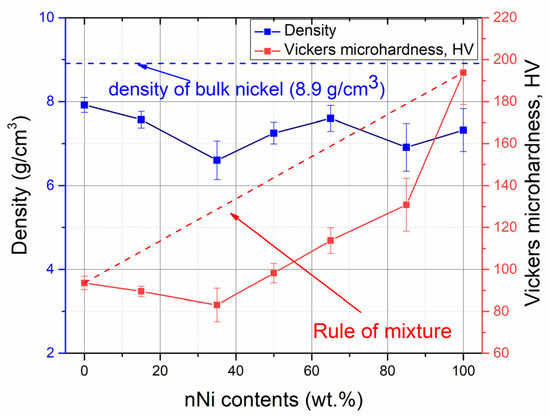 The data on the specimen’s density and Vickers hardness are presented in Figure 4. As seen from the figure, the densities of the specimens manufactured using a powder metallurgy approach are somehow lower than that determined for the density of bulk Ni (8.9 g/cm3). The specimens’ density changes close-to-linear within the experimental error, exhibiting a local minimum for the 35nNi specimen. This might be due to the presence of numerous defects in the microstructure caused by the irregular packing of the particles during the initial compaction of the metal powder. Despite only the 85nNi specimen consisting of submicron grains (mean grain size is 0.65 ± 0.05 μm), it is characterized by a rather low amount of HAB and CLS fractions (31.2 and 10.7%, see Table 2). The values are close to the ones obtained for 100mNi specimens. The latter shows the lowest HAB and CLS fractions as well as the coarser grains and lower hardness values. The 50nNi specimen is characterized by its balanced properties. In contrast to the other specimens of series I, the grain size distribution in the 50nNi specimen is close to bimodal (see Figure S2). Analyzing the above results, the use of Ni powder having a complex fraction composition (50nNi–50mNi) is prospective for further reinforcement using graphene.
