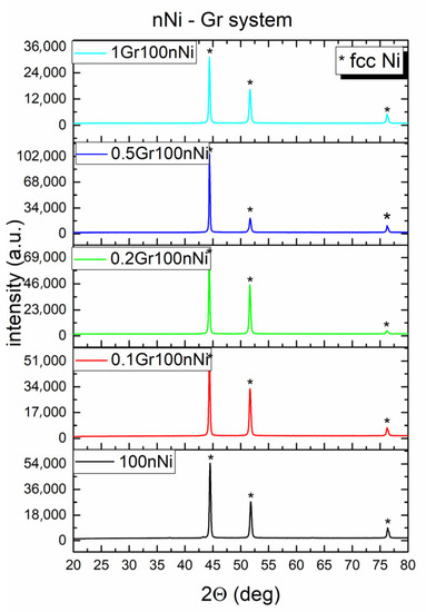 The X-ray patterns obtained for the 100nNi specimen and the 0.1Gr–nNi, 0.2Gr–nNi, 0.5Gr–nNi and 1Gr–nNi composites (specimen series II).