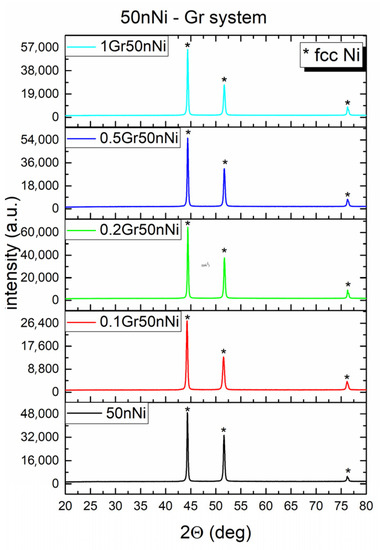 The X-ray patterns obtained for the 50nNi specimen and 0.1Gr–50nNi, 0.2Gr–50nNi, 0.5Gr–50nNi and 1Gr–50nNi composites (specimens of the series III).