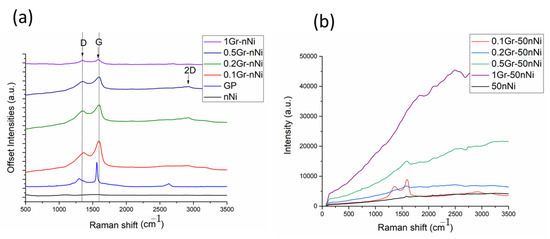 Raman spectra obtained for (a) series II composites and (b) series III composites in comparison with the data for thermally exfoliated GP, 100nNi and 50nNi.