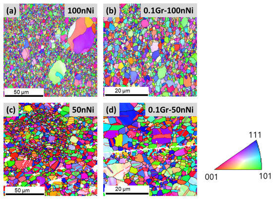 IPF maps obtained for (a) 100nNi specimen, (b) 0.1Gr–100nNi composite, (c) 50nNi specimen and (d) 0.1Gr–50nNi composite. The striations are traces of polishing.