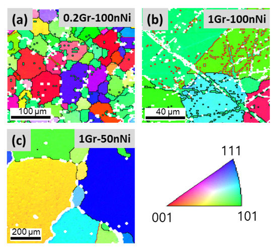 IPF images obtained for (a) 0.2Gr–100nNi and (b) 1Gr–100nNi composite under different resolutions; (c) 1Gr–50nNi composite.