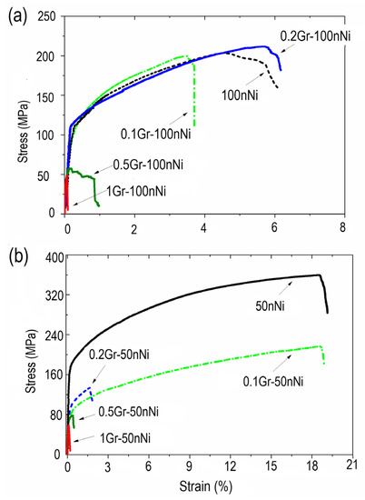 As seen from Figure 13a, the mechanical properties of 100nNi, 0.1Gr–100nNi and 0.2Gr–100nNi exhibit close ultimate tensile strength (UTS) values and yield limit (YL). Among composites with a 100nNi matrix, the 0.2Gr–100nNi composite shows the best combination of uniform elongation and UTS and YL being close to 100nNi. The 0.1Gr–100nNi composite shows a slightly decreased ductility of its nickel matrix. The 0.1 wt.% GP incorporation results in about a factor of two decreases in UTS and yield limit values, while the elongation remains almost the same, allowing for experimental error. The composites of both series II and III fabricated from powders having a graphene content of 0.5 and 1 wt.% demonstrate drastically decreased UTS and elongation values. The presence of pore agglomerates as well as the multi-layered graphene flakes in the grain boundaries result in the low bonding between the graphene additive and nickel matrix and the simultaneous decrease of strength and ductility.