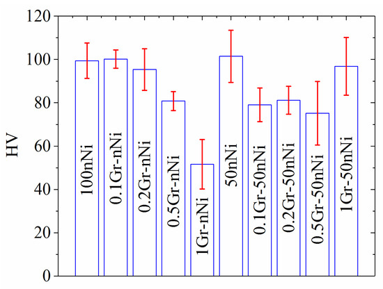 Vickers hardness data is presented in Table 3 and Figure 14. The hardness values of reference samples 100nNi and 50 nNi, presented in Figure 4 and Figure 14, differ by almost twice. It is due to the difference in the manufacturing approach: specimens of series I were manufactured using an additional step of hydrostatic pressing at 152 MPa, whereas series II and III were not made the same way. Comparing the Vickers hardness data of 100nNi specimen after two-step compaction and Gr–100nNi composites obtained, one can see that the values of hardness are also twice decreased when uniaxial compaction is used. Increased hardness of the specimens after additional processing are likely due to the same strengthening mechanism related to grain sizes. Refined microstructure (absence of pores and large microstructure defects) leads to an increase of hardness values. The hardness of Gr–Ni composites manufactured from nNi powder show the gradual decrease of values with the increase of GP content from 0.2 to 1 wt.%. In contrast, specimens of series III with 50nNi demonstrated a different behavior. As seen from Figure 14, the Vickers hardness of the reference specimen 50nNi manufactured with no additional compaction step is close to that of the composite with the maximum Gr contents (1Gr–50nNi), while the specimens 0.1Gr–50nNi, 0.2Gr–50nNi and 0.5Gr–50nNi are characterized by somehow lower hardness, which is nearly the same for these specimens.
