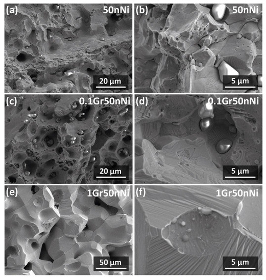 As seen from the figures, the fracture surface changes depending on graphene content. At the same time, the surface of all specimens contains particles of different sizes, resembling the shape of metallic nickel. Fracture surfaces, obtained for specimens with the same graphene content but different initial nickel precursor powder sizes, have similar features. However, they are different from those for 100nNi and 50nNi specimens (see, Figure 15 and Figure 16a,b). The fracture surface of 100nNi composite consists primarily of shallow dimples of different sizes, where the particles are situated. The particles may act as the origin of the voids. Despite the more pronounced plastic deformation of the 50nNi specimen, dimple fracture is localized in disparate agglomerations along its fracture surface. The intergranular fracture process is expressed during the fracture of the 50nNi specimen, and it is followed by the secondary cracks. In addition, pronounced slip traces are observed on the grain boundaries. Thus, the plastic deformation of the two series of specimens is due to the different mechanisms. The specimens manufactured from bimodal nickel powder showed significantly higher tensile strength and elongation. The fracture surface relief becomes more uniform with the Gr amount increase. The dimple-like fracture contribution to the overall specimen fracture decreases when compared to the 100nNi sample. The brittle intergranular fracture starts to prevail. As seen in Figure 16e,f it is characterized by the pronounced block steps on the intergranular crack’s surface. As discussed in [48], such an image of the fracture may be a result of the shear band’s collision with a crack. The ledge formed favors the further brittle fracture process. One more mechanism can be due to the deformation in the region of the crack tip. Therefore, the traces of slips and twinning are left on the crack’s surface. The observed step-like formations can take place on the grain surfaces or on the edge with pores or inclusions during the solidification and cooling of the material. This favors a surface energy decrease, when there is not enough material to fulfill the voids. The composites having 1 wt.% GP (1Gr–nNi and 1Gr–50nNi, see Figure 15 and Figure 16e,f have smooth facets of the intergranular fracture with no typical features of plastic deformation. The 1Gr–100nNi and 1Gr–50nNi specimens are characterized by the highest porosity value.