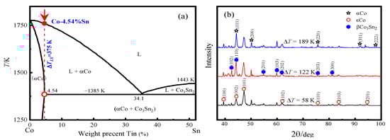 Selection of alloy composition and X-ray diffraction of rapidly solidified alloy droplets. (a) Co-4.54%Sn alloy location in phase diagram and (b) XRD pattern.