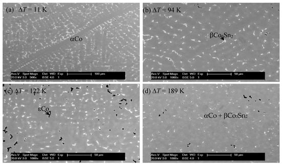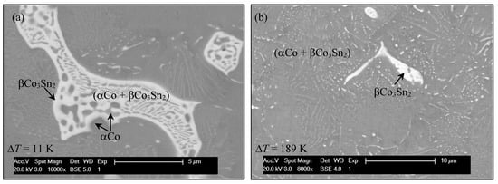 The phase constitution of Co-4.54%Sn alloy was selected with the largest solid solubility point of Sn solute in Co solvent; as shown in the binary Co-Sn phase diagram of Figure 1a,b, the liquidus and solidus temperatures were 1760 and 1385 K, respectively, and the solidification temperature range attained 375 K (0.21 ). From the equilibrium phase diagram, it can be seen that the primary face-centered cubic αCo solid solute phase formed in the liquid phase when the temperature reduced to 1760 K; firstly, during the solidification, the solute content was about 0.56 wt.%Sn in the αCo phase, and then the βCo3Sn2 intermetallic phase was generated as the temperature lowered to about 1443 K. Subsequently, the close-packed hexagonal εCo phase had the potential to form once the temperature decreased to about 695 K. Furthermore, the X-ray diffraction patterns showed three phases of αCo, βCo3Sn2 and εCo displayed at the different undercoolings under the rapid solidification, which corresponds with the equilibrium phase diagram. The microstructures of binary Co-4.54%Sn alloy relate to the undercooling at rapid solidification, which are shown in Figure 2a–d. At the small undercooling of 11 K, the microstructure of the primary αCo phase was characterized by the coarse and well-developed dendrites, the βCo3Sn2 phase distributed into the interdendrites, shown as the white phase and the εCo phase displayed the dark structures, as seen in Figure 2a. Subsequently, the microstructure was remarkably refined and the dendritic feature disappeared gradually; the volume fraction of βCo3Sn2 phase decreased at the same time, but the volume fraction of the εCo phase increased with the increase of undercooling. Ultimately, the microstructure of the primary αCo phase grew with the disorder at the largest undercooling of 189 K, and a small number of βCo3Sn2 particles and a large number of εCo phase distributed randomly into the matrix of the primary αCo phase. Clearly, the phase constitution has not changed at the rapidly solidified condition. It is worth noting that the eutectic-like microstructure exists in the whole undercooling of the binary Co-4.54%Sn alloy, as seen in Figure 3a,b, which grew around the βCo3Sn2 phase. Meanwhile, the eutectic-like structure appears coarsening and the volume fraction increased obviously with increase of undercooling and decrease of the βCo3Sn2 volume fraction, and formed eutectic cell characteristics at the largest undercooling of 189 K.