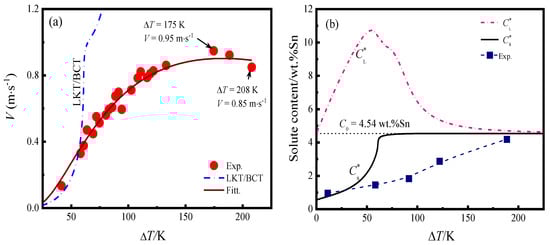 Measured and calculated dendritic growth velocity and solute content of rapidly solidified binary. Co-4.54%Sn alloy versus undercoolings, (a) dendritic growth velocity, and (b) solute content.