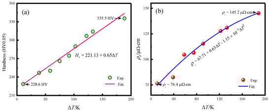 Apparently, undercooling has a significant influence on microhardness. From the analysis above, it can be seen that large undercooling had more obvious recalescence, which led to the refined microstructure, and also enhanced the dendritic growth velocity and solute content. Therefore, the refined structure had increased grain boundary and larger solute content, which improved the microhardness under rapid solidification []. In addition, the microstructure also affected the hardness of Co-4.54%Sn alloy. Similarly, the undercooling also prompted the resistivity of binary Co-4.54%Sn alloy to rise, as displayed in Figure 5b. To describe the relationship between resistivity ρr and undercoolings ΔT, an expression is proposed: