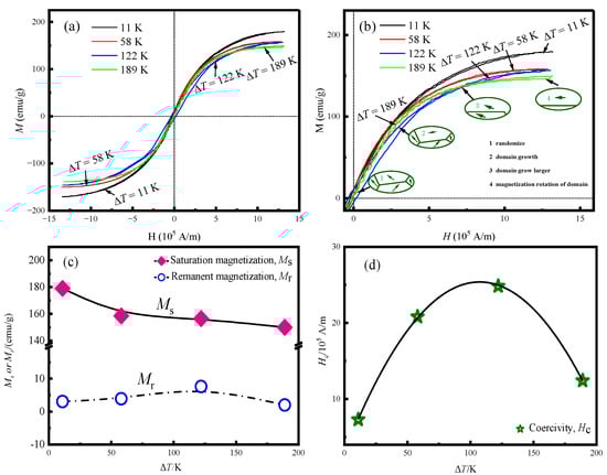 With the increase of undercooling, the saturation magnetization of the alloy decreases from 178.92 emu/g to 149.94 emu/g, which is caused by the refinement of the microstructure, and the enhancement of dendritic growth velocity and solute content for the primary phase. Han et al. showed that alloy variants with larger average particle size usually have higher saturation magnetization, which is consistent with this result []. Compared with the undercooling of 11 K (3.04 emu/g, 7.3 kA/m), the undercooling of 189 K has lower remanent magnetization and higher coercivity, which are 2.01 emu/g and 12.42 kA/m, respectively. In addition, with the increase of undercooling, the squareness ratio showed an “increase first and then decrease” trend. The remanent magnetization and coercivity also exhibited a trend of increasing first, then decreasing with the increase of undercooling and solute content, as shown in Figure 6c,d. The reason is that the crystal particle and boundary are raised significantly due to the refinement of microstructure and enhancement of solute content with the increase of undercooling, and a large amount of solute is distributed into the primary phase, which leads to the decrease of saturation magnetization and the increase of the remanent magnetization and coercivity. When the undercooling ΔT was 189 K, the remanent magnetization and coercivity were decreased in that the volume fraction of eutectic cell was higher than the undercooling of 11 K. Furthermore, a more in-depth study of the magnetic mechanism is still needed.