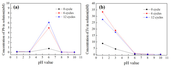 Ion concentration in solution varied with pH value after T-FTC of LBJ. (a) Pb; (b) Fe.