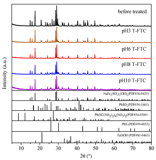 The results indicate that at pH 3, the jarosite crystals treated by T-FTC are corroded by acid (Figure 3a), leading to the formation of numerous pits and grooves on the previously smooth and compact surface, and resulting in a fluffy jarosite matrix. This structure is conducive to the adsorption of dissolved Pb ions or Pb-tu generated by the reaction, resulting in a low lead content in the solution. At pH 6, the lead sulfate embedded on the surface of the lead-containing jarosite treated by T-FTC has mostly fallen off (Figure 3b). The crystal structure of jarosite remains essentially unchanged, and XRD analysis (Figure 2) shows that the characteristic diffraction peak of lead sulfate decreases compared with that of lead-containing jarosite before being treated. It is possible that thiourea can decompose into S2− at a high pH and form a PbS precipitate, which appears as submicron floc on the surface of the jarosite matrix in SEM analysis. Alternatively, the increase in pH can cause the secondary hydrolysis of iron in the solution to form flocculent ferric hydroxide. At pH 10, more flocculent precipitates are distributed on the surface of the jarosite, as shown in Figure 3d. Furthermore, a bright white film, which is different from the fine particles, encases the jarosite. XRD analysis reveals the presence of a new phase of PbS, which is presumed to be a layer of wrapping film formed by submicron PbS particles gathering near the goethite.