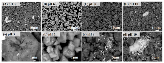 To further understand the effect of the pH value in the T-FTC process on the phase and micromorphology of LBJ, XRD and SEM-EDS analyses were conducted for 12 T-FTC cycles under different pH values (3, 6, 8, and 10). The results are presented in Figure 2 and Figure 3.