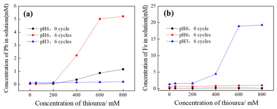 Experimental conditions: In total, 1 g of LBJ was used with a liquid–solid ratio of 30 mL/g and a freezing temperature of −20 °C. The release of the Pb and Fe in the LBJ into the solution was investigated under the conditions of a thiourea concentration of 0 mM/L, 200 mM/L, 400 mM/L, 600 mM/L, and 800 mM/L; pH values of 3 and 6; and T-FTC with 0 and 6 cycles. The results are shown in Figure 4.